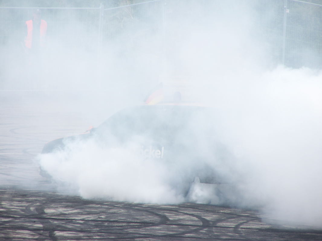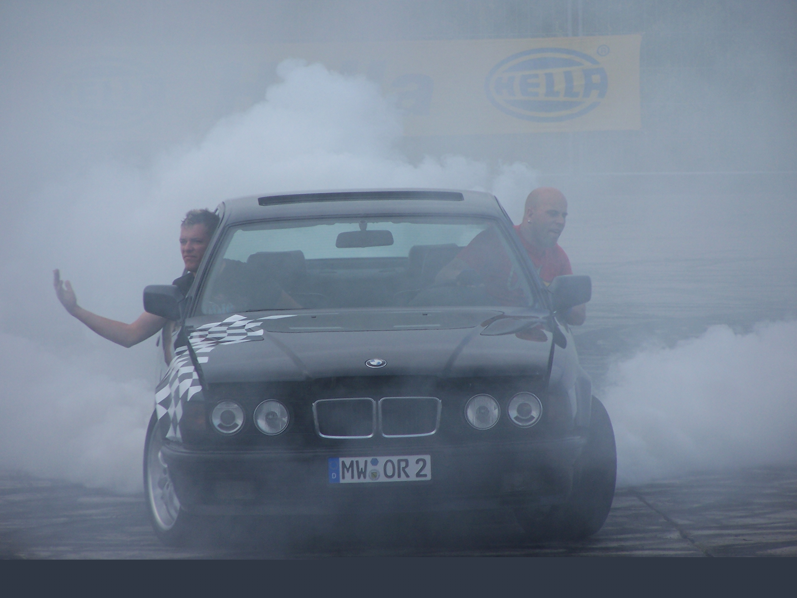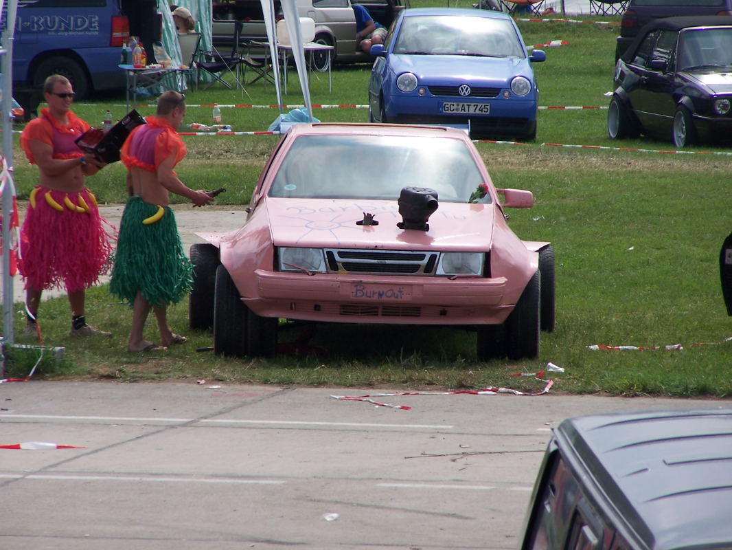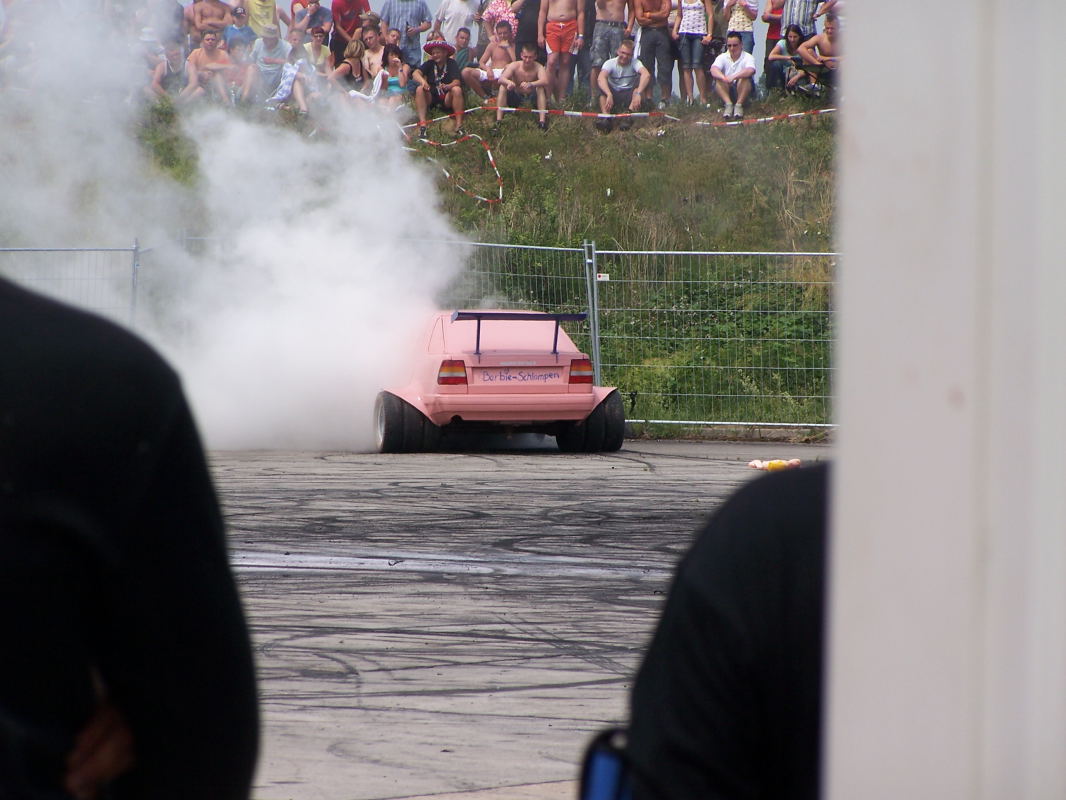 Nun war es endlich soweit!!!!!! Das Pfingstwochenende stand vor der Tür und damit auch die Burnout-WM!!! Punkt eins ging es los in Richtung Bautzen. Die Fahrt verlief ohne Zwischenfälle, nur die Aufregung wurde immer größer. In Bautzen angekommen wurde erstmal alles vorbereitet, Auto abladen, Zelt aufbauen etc.! Nach ein paar Bieren war es auch schon so weit. Das freie Training stand an, hier galt es das Modul erstmal richtig testen ob auch alles so funktioniert wie man sich das so vorher gedacht hatt. Und los gings in denn Wall, alles lief bestens das Kreisel ging perfekt Qualm kam auch ordentlich und die Menge tobte, zum schluß wollten wir noch zusammen Burnen dieß ging auch soweit. Doch plötzlich zog es meinen Motor zuzsammen, irgendwie kamm das Teil nicht mehr auf Touren und die Räder drehten auch nur schwerfällig. Ich dachte erst an Kupplung oder so doch wo wir wieder draußen waren wurde uns alles klar "kapitaler Motorschaden" ach du scheiße, nun ging nur noch eine Seite für uns war die Sache klar, das werden heute noch überstunden. Nicht lange überlegt das Modul auf den Hänger geladen und ab nach hause zum Motorwechsel. Als ich Andi und Roland 20,30Uhr in Oederan an der Garage angekommen waren, sprang uns gleich der GSI der da noch in der Ecke stand in die Augen. Dieser sollte das Eisen gut vorran treiben. Doch vorher war noch der alte Motor im Modul fällig. An ging er ja noch, fix Öl und Wasser abgelassen und dann Vollgass und schon hatt man einen schönen einblick in einen Motor. 1.30 Uhr waren wir fertig nun gings wieder hoch nach Bautzen dort angekommen so ca. gegen 3.15 Uhr tranken wir nochn Bier und gingen zufrieden ins Bett!!