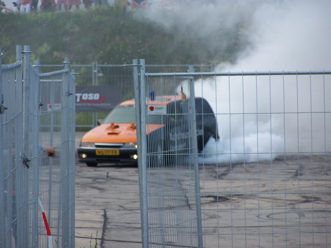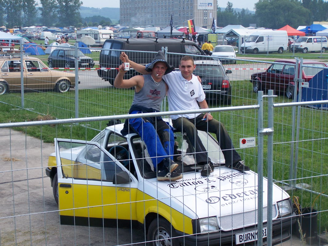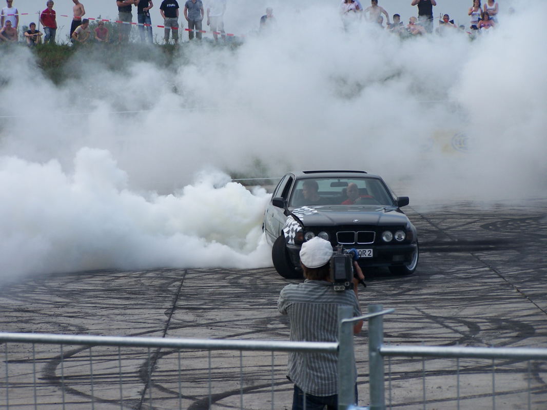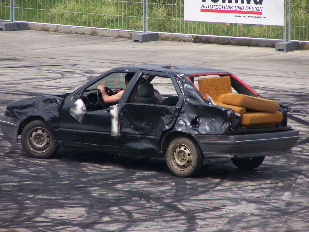 Nun war es endlich soweit!!!!!! Das Pfingstwochenende stand vor der Tür und damit auch die Burnout-WM!!! Punkt eins ging es los in Richtung Bautzen. Die Fahrt verlief ohne Zwischenfälle, nur die Aufregung wurde immer größer. In Bautzen angekommen wurde erstmal alles vorbereitet, Auto abladen, Zelt aufbauen etc.! Nach ein paar Bieren war es auch schon so weit. Das freie Training stand an, hier galt es das Modul erstmal richtig testen ob auch alles so funktioniert wie man sich das so vorher gedacht hatt. Und los gings in denn Wall, alles lief bestens das Kreisel ging perfekt Qualm kam auch ordentlich und die Menge tobte, zum schluß wollten wir noch zusammen Burnen dieß ging auch soweit. Doch plötzlich zog es meinen Motor zuzsammen, irgendwie kamm das Teil nicht mehr auf Touren und die Räder drehten auch nur schwerfällig. Ich dachte erst an Kupplung oder so doch wo wir wieder draußen waren wurde uns alles klar "kapitaler Motorschaden" ach du scheiße, nun ging nur noch eine Seite für uns war die Sache klar, das werden heute noch überstunden. Nicht lange überlegt das Modul auf den Hänger geladen und ab nach hause zum Motorwechsel. Als ich Andi und Roland 20,30Uhr in Oederan an der Garage angekommen waren, sprang uns gleich der GSI der da noch in der Ecke stand in die Augen. Dieser sollte das Eisen gut vorran treiben. Doch vorher war noch der alte Motor im Modul fällig. An ging er ja noch, fix Öl und Wasser abgelassen und dann Vollgass und schon hatt man einen schönen einblick in einen Motor. 1.30 Uhr waren wir fertig nun gings wieder hoch nach Bautzen dort angekommen so ca. gegen 3.15 Uhr tranken wir nochn Bier und gingen zufrieden ins Bett!!