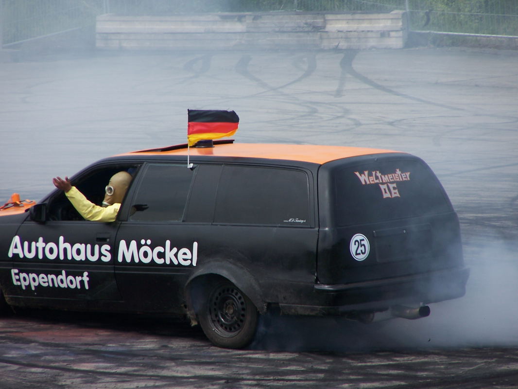 Nach einer wilden Nacht die Frühs so gegen 6.00 Uhr endete trieb es uns erst kurz vor dem Finale aus unseren Zelten. Leider mußten wir einen ausfall hinnehmen Roland lag wie tot in seinem Wohnwagen und konnte sich nicht mehr bewegen!!! Und schon war es wieder soweit, noch einmal in den Wall und das wie gesagt nur noch mit einem Motor. Das Startsignal fiel, wir fuhren los und drehten ca. 2 Runden da wurde auf einmal die rote Flagge geschwenkt. Was nun? Es roch auf einmal etwas nach Benzin. Nach einem kurzen Blick auf den Tankstutzen war klar da fehlt doch was: "der Deckel". Nun wars für uns schon aus, weil wo sollte man jetzt son Teil herbekommen. Doch da sahen wir uns zum Glück noch etwas um und erspähten auserhalb des Walls einen kleinen Punkt auf der Straße, ja es war der Deckel, wie er dort hingekommen ist bleibt ein Rätsel. Höhere Gewalt? Zum Glück gab es noch einen zweiten Versuch nur leider drehten wir da genauso viel Runden wie im ersten nur das jetzt kein Tankdeckel mehr fehlte sondern das Modul stehen blieb tja das wars nun endgültig mit der WM. Andi hatte das gleiche Probleme wie ich, der Motor lief aber nix ging mehr vorran. Uns wurde später noch gesagt das wir bis zum Finale in den Punkten die Führenden waren aber wenn die Technik nicht hällt Pech gehabt. Unser Glückwunsch geht natürlich an den alten und neuen Weltmeister M. Mökel der in seinem Omega auch eine 1A Show abgeliefert hatt. Zuhause angekommen nahemen wir gleich unsere Motoren unter die Lupe und stellten fest das auch in dem zweiten zu wenig Öl drin war und dadurch es das Getriebe zermehrt hat. Aus meinen Getriebe kamen irgendwelche Teile raus wo man nur noch mit viel Phantasie erahnen konnte das dies mal ein Zahnrad war. Naja jetzt haben wir ja erstmal wieder eine Menge zutun bis es wieder heist Burnout-WM 08. Und lasst euch eins noch sagen egal was passiert:"Mit dem Öl nicht sparsam sein"!